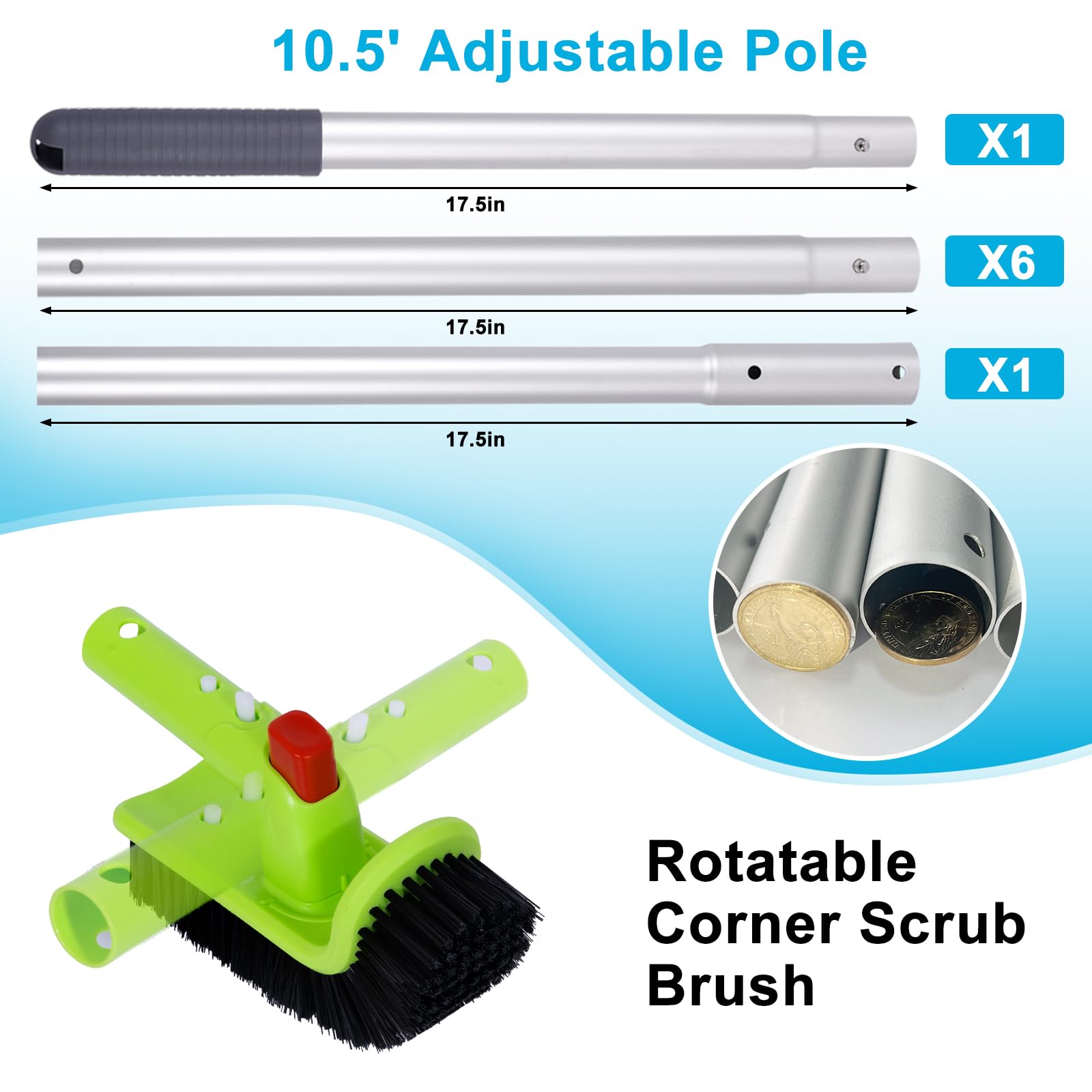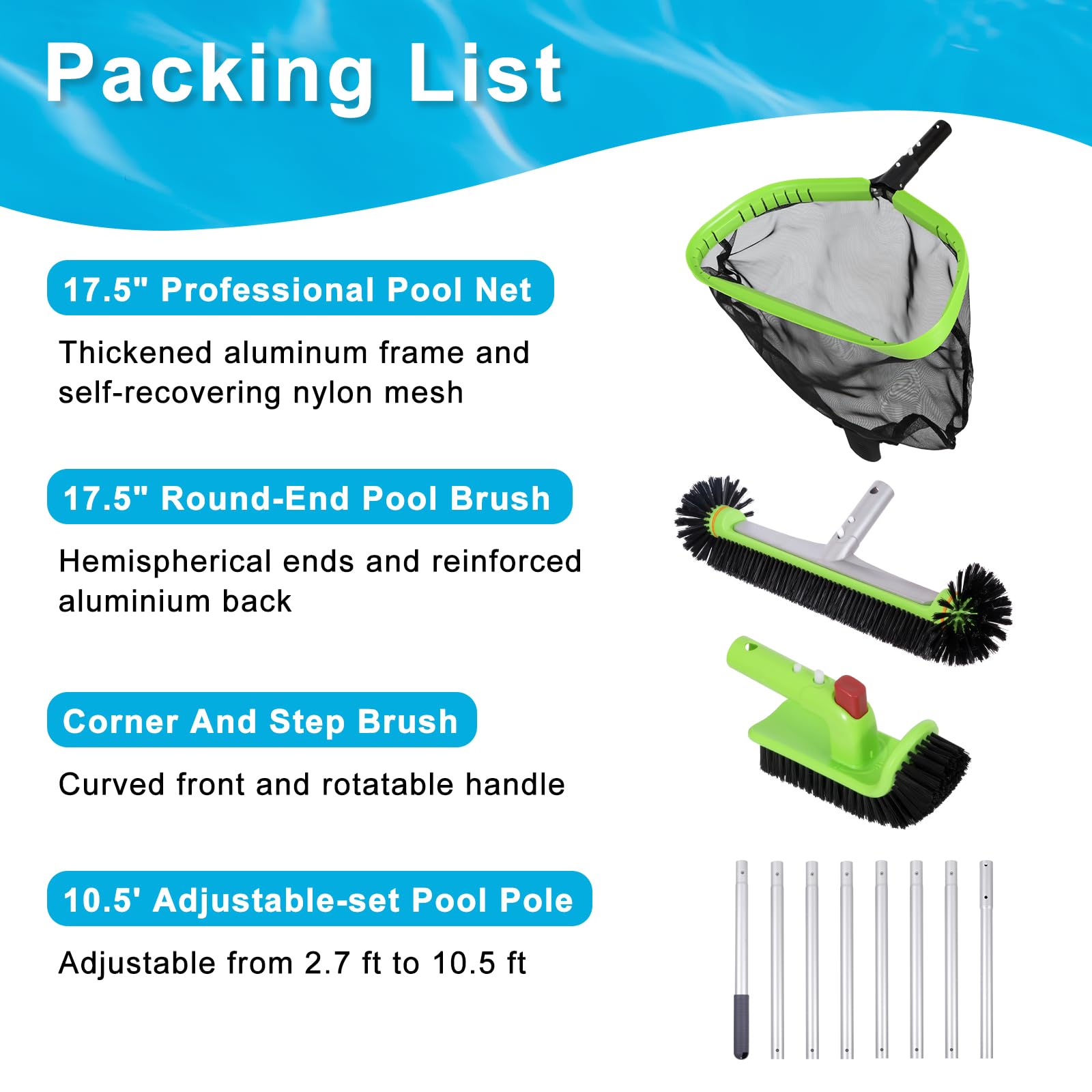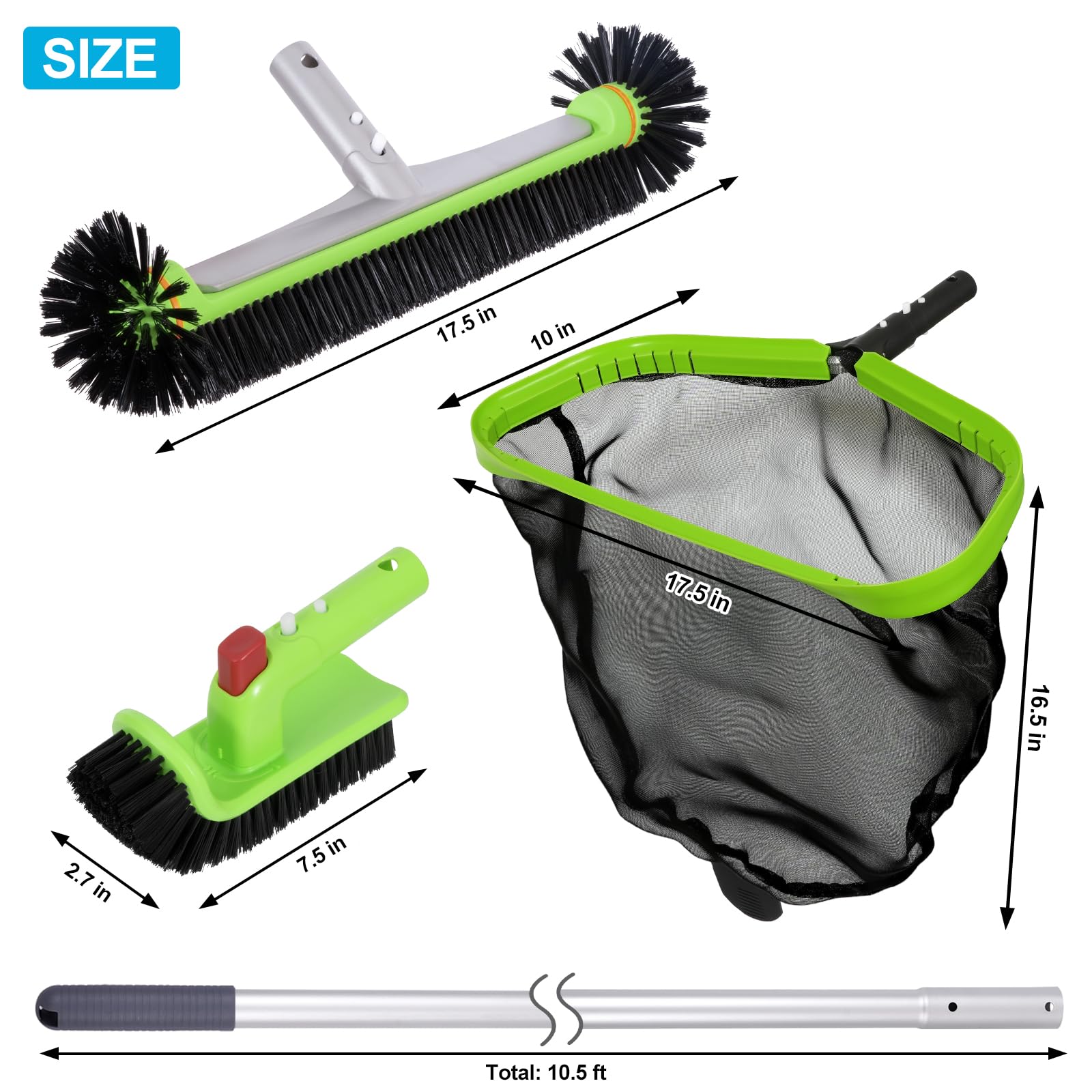 - [Keep your pool clean with ease] This kit includes a professional pool net, heavy-duty 17.5″ round pool brush head, rotatable scrub brush and 10.5 FT pole