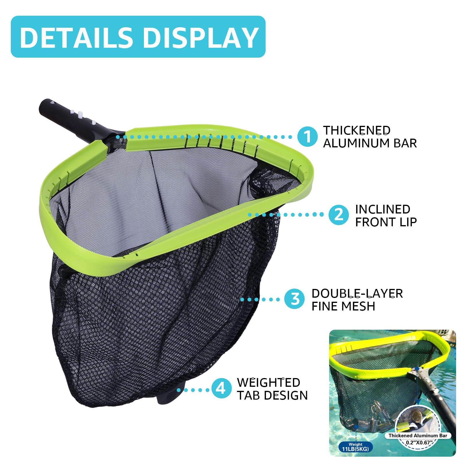 - [Easily scoop out debris with inclined lip pool net] Our heavy duty aluminum frame pool net is designed with a widened and inclined edge that makes it easy to scoop out debris from the bottom of the pool.