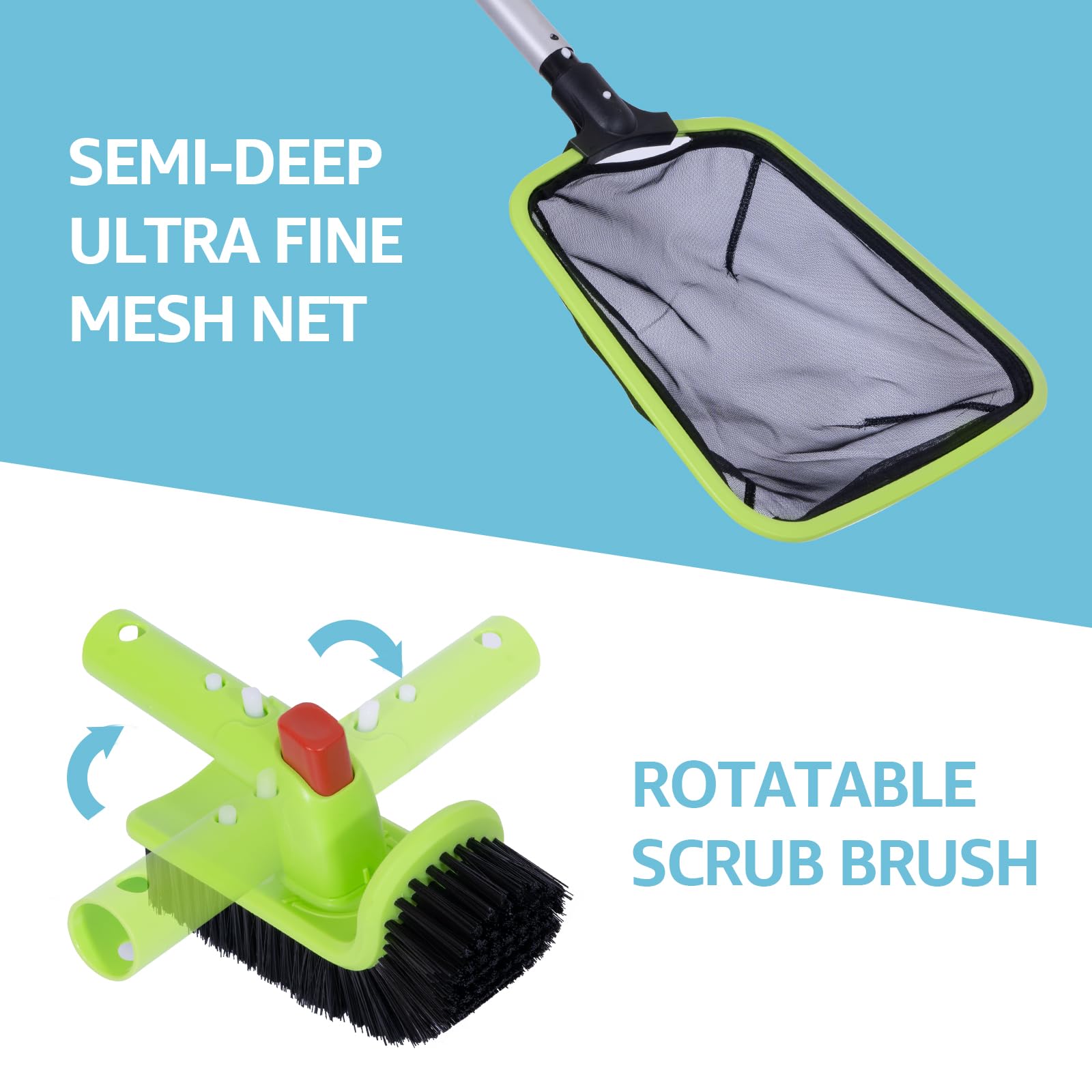 - [Easy to use rotatable scrub brush] Our rotatable scrub brush handle can be rotated left and right at 90° by pressing the red button, making it easy to clean hard-to-reach areas of your pool.