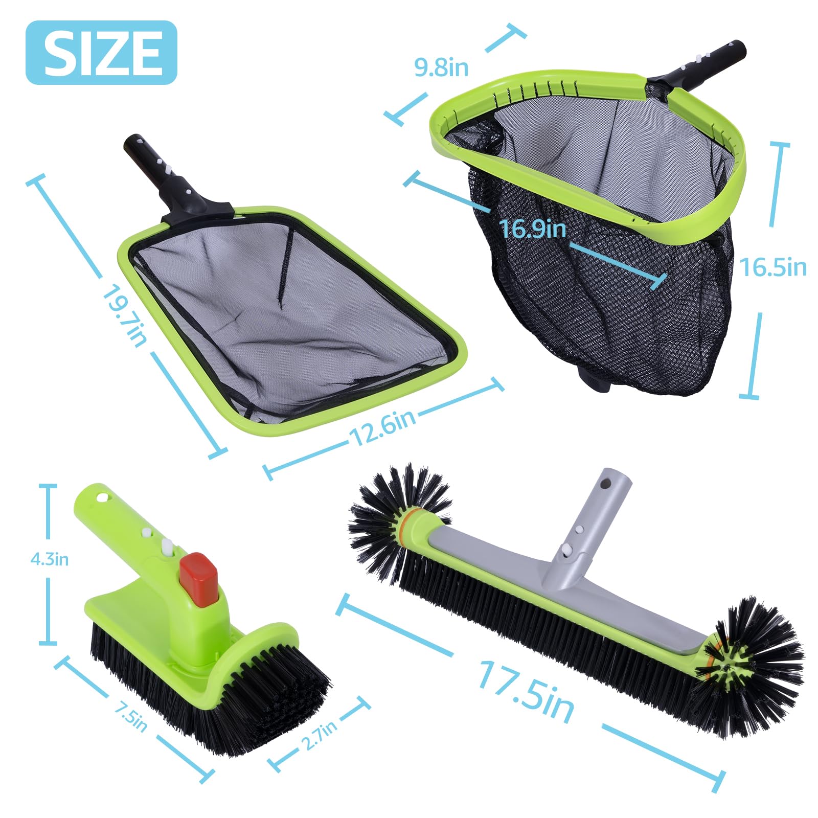 - [Keep your pool clean with ease] This kit includes a Professional pool net, semi-deep skimmer net,heavy-duty 17.5″ round pool brush head, and a rotatable scrub brush.